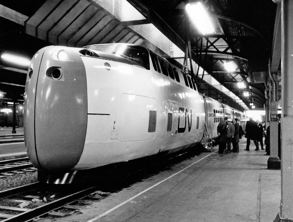 After the end of the CN-CP pool train agreement in 1965, Canadian National’s focus was put towards updating their intercity and regional passenger trains. In doing so, CN would bring Canada the closest it has ever come to a proper high speed rail system. A total of five “Turbo Trains” built by the United Aircraft Corporation were ordered by Canadian National in 1966. These high-speed gas turbine trainsets were designed to reach speeds of 274 km/hr, and CN planned to use them in intercity service between Toronto and Montreal. Glass domes at both ends of the train provided a viewing opportunity for passengers, a design feature that was more commonly seen on the transcontinental trains of the time. It was clear that competition with the airline industry was one of the prevailing thoughts behind this train, with a 1967 report from the Globe and Mail stating: “Passengers will find some similarities with aircraft accommodation even if there are no seat belts and no smoking signs”. The train sets featured other overlaps with airliners such as overhead baggage compartments and meal service. The new train sets were expected to enter service in time for Expo ’67, but external circumstances such as the Vietnam War resulted in delays. A pair of Turbo Trains made their inaugural runs on December 12th, 1968, with each one departing in opposite directions from Montreal and Toronto. The press on board the Montreal-bound train would bear witness to the train colliding with a truck at a crossing near Kingston, Ontario, creating an embarrassing situation for CN and perhaps signalling what was to come for the Turbo. Technical problems into the early 1970’s took the Turbo Train out of service entirely until 1973. Its speed was also limited by the unwillingness of the railway to properly upgrade their track or the many grade crossings along the route, which kept the speed limit of the Turbo Train at a measly 153 km/hr (95 mph).