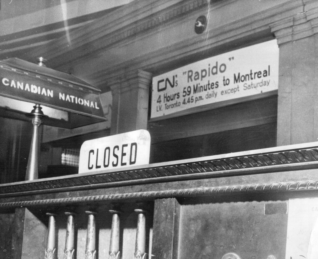 Despite the impetus of Canadian National being that of a public service, aggressive efforts to improve profitability were still made to mitigate the effects of reduced ridership. The most unprofitable passenger routes saw either a reduction or the entire removal of service. Many rural branch lines east, west, and north of Toronto were subsequently abandoned and torn up. Historic stations on former passenger routes were often quickly demolished to minimize expenses resulting from property tax, until local preservation efforts could be formed in response during the following decades. Contrasting with this loss, Canadian National was actively working on reimagining their service and brand. It was in the context of this rapid change that Canadian National’s “wet noodle” logo was designed by Canadian graphic designer Allan Fleming in 1960, and its subsequent success has extended its use up to the present day.