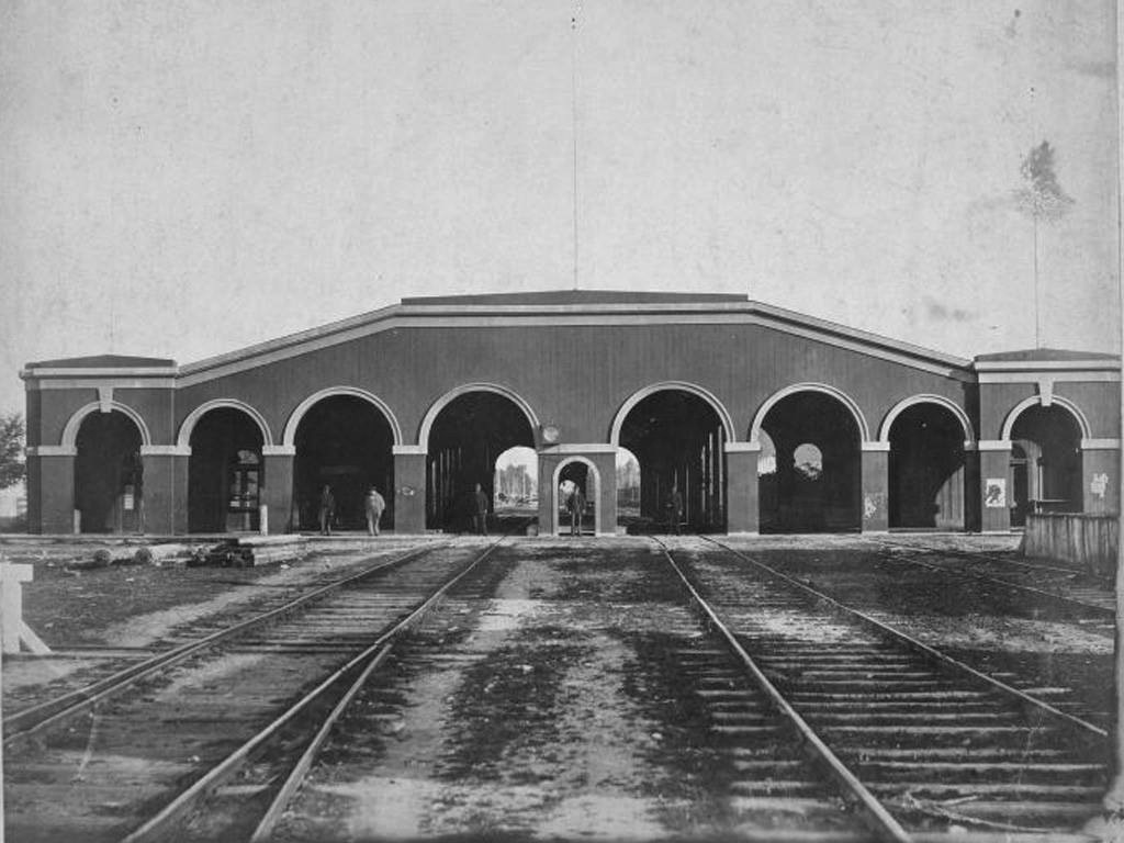 Construction of the OS&H continued vigorously throughout the rest of 1853. In June of the same year, company directors selected a specific location on the shore of Lake Huron for the railway to terminate. A rural area west of the mouth of the Nottawasaga River – the modern-day site of Collingwood, Ontario – was their choice. In doing so, the railway’s right-of-way was shifted in a westerly fashion away from the soon-to-be Village of Barrie and through the comparably sized community of Allandale. The Ontario, Simcoe & Huron extended service to Bradford on June 13th, 1853, then to Allandale on October 11th of the same year. While work on the mainline was ongoing, a 2.3-kilometer branch line was opened between Lefroy and the shore of Lake Simcoe at Belle Ewart on May 2nd, 1854. The purpose of this line was twofold depending on the season – for lake-faring steamship passengers during the summer months, and for the shipment of lake ice for food preservation during winter. On December 16th, 1854, construction of the mainline to Collingwood was officially completed and, on that date, a special train carrying railway officials made the journey from Toronto in three hours. Regular service to Collingwood would not commence until three weeks later on January 2nd, 1855. The surrounding community, which was little more than a clearing in the woods known as Hen and Chickens Harbour, would be incorporated as the Town of Collingwood three years later. Here, the OS&H built what was then the grandest passenger station on their entire system. Its design was heavily influenced by Spanish architecture styles. A total of eight arched portals, three of which were occupied by tracks, were perhaps the building’s most striking features. The OS&H station in Toronto was little more than a wooden shed by comparison.