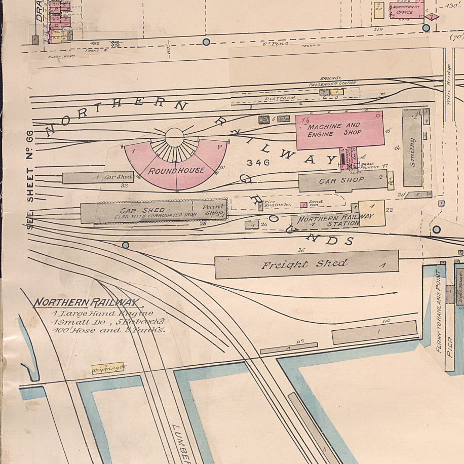 The Northern Railway of Canada, originally established as the Ontario, Simcoe & Huron Railway in 1850, was Toronto’s first railway and the first steam-powered railway in Canada West. It would become one of several local railway companies to form during Canada’s railway boom era, establishing a strong foothold in the region during the 35 years it operated. Originally intended as a ‘portage’ route to connect Lake Ontario with Lake Huron, it would go on to reach Lake Erie at its southern end and Lake Nipissing in the north at its greatest extent. It provided Torontonians with the most direct rail connection with Canadian Pacific’s transcontinental line across some of the most difficult terrain in the province, a feat no other railway would achieve until two decades later. Even though it would ultimately amalgamate with the Grand Trunk Railway in 1888, much of the Northern Railway system actively carries passenger and freight trains today.