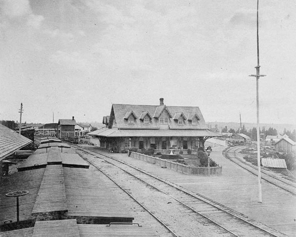 The Northern, North-Western and Sault Ste. Marie Railway’s name was changed to the more concise Northern and Pacific Junction Railway on May 25th, 1883. On June 11th, 1884, tenders were finally opened for its construction. Work began shortly thereafter from the southern end of the line at Gravenhurst and the northern end at Nipissing Junction simultaneously, and by March 13th, 1885, the Toronto World triumphantly reported that the first segment of the Northern & Pacific Junction Railway was completed to a point just south of the Muskoka River in Bracebridge. Between that point and Nipissing Junction is where some of the heaviest work occurred, involving rock cuts as deep as 50 feet and removing as much as 100,000 yards of stone and soil in places. The longest bridge on the entire line was a 3,900-foot wooden trestle near Powassan which required over a million feet of timber in its construction. On the morning of January 20th, 1886, the tracks of the northern and southern sections of the Northern and Pacific Junction Railway were joined together. There was still much work to be done before the line was ready for train traffic, but the joining of these segments shortened the distance by rail between Toronto and Port Moody, British Columbia by 342 kilometres (213 miles). Seven days later, a special train brought politicians, railway executives and contractors from Hamilton to inspect the recently completed Northern and Pacific Junction Railway. The train arrived in Gravenhurst at 2:15 that afternoon and stopped for the night in Burk’s Falls before continuing north at 7:15 the following morning. The train finally reached La Vase (later renamed Nipissing Junction), after which telegrams were sent to Prime Minister John A. Macdonald and Canadian Pacific Railway president Sir George Stephen to announce the train’s arrival.