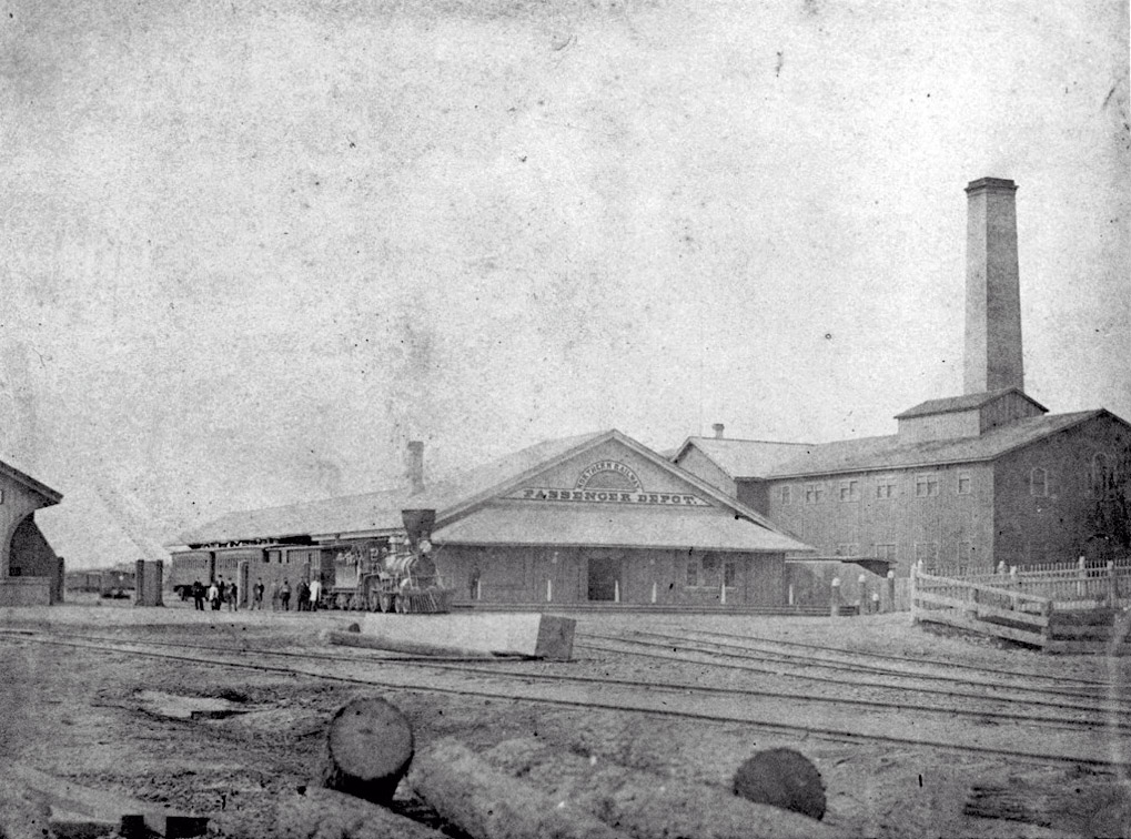 During the same period, the Northern Railway made numerous improvements to its facilities in Toronto. On June 10th, 1867, a new passenger station was built on the east side of downtown Toronto at the corner of The Esplanade and Market Street. The City Hall Station, as it was known, was mostly built as a convenience for farmers who wished to bring their products to the market square near Front Street and Jarvis. In attendance at the new station’s opening ceremony was none other than John A. Macdonald, who would become the first Prime Minister of the Dominion of Canada three weeks later. In 1870, the Northern Railway’s earlier grain elevator at the harbour west of Spadina Avenue burned down, prompting the railway to build a new one measuring 140 feet in height and capable of storing up to 260,000 bushels of grain. When the Northern Advance newspaper in Barrie reported on the experience of riding the Northern Railway from Toronto on October 9th, 1871, it described the new grain elevator as the “first object of interest” when departing the city and observed that it “rose over ever surrounding object”. A new roundhouse had also been built on the west side of Spadina during the same year, replacing an older eight-stall enginehouse which was made from wood and dated back to the railway’s beginnings. The new structure was predominantly made from brick, had a total of fourteen locomotive stalls, and according to the Northern Advance included a “fluted galvanized iron roof, ends, and sides, and doors sheathed with the same material”.