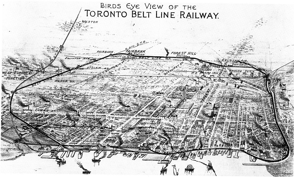 In 1889, a group of prominent businessmen formed the Toronto Belt Land Corporation to develop large parcels of land north and west of the city into new residential neighbourhoods that were located beyond the reach of the city’s streetcar lines. The developers proposed to link these suburbs to downtown Toronto with a new Belt Line steam railway that would encircle the entire city.