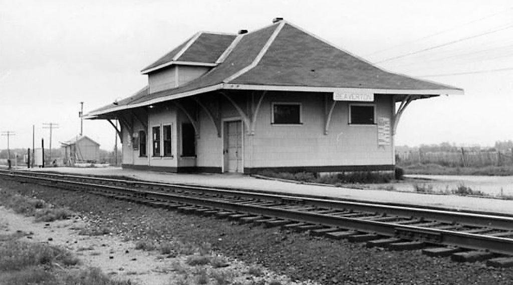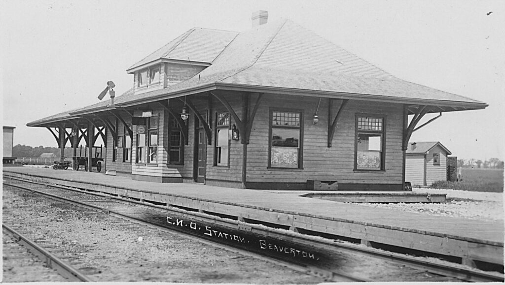 The Canadian Northern Railway reached Beaverton in 1906 while construction of the railway was progressing south towards Toronto. Beaverton had rail service for a few decades before the Canadian Northern’s arrival in the form of the Midland Railway of Canada, which reached Beaverton in 1872. However, its route to Toronto was far from direct, involving a transfer at Lorneville Junction. The Canadian Northern gave Beaverton a quicker way to reach Toronto as well as northern Ontario and western Canada. Its station in Beaverton, while not of a particularly substantial size, was more than large enough to handle the relatively small population of Beaverton at the time. It would have contained a waiting room and a freight room, with the station agent’s office located between the two inside the rectangular bay window. Initially, the north side of the structure had a canopy extending from the roof to act as a shelter over the platform. For whatever reason, this design feature was removed several decades later.