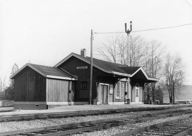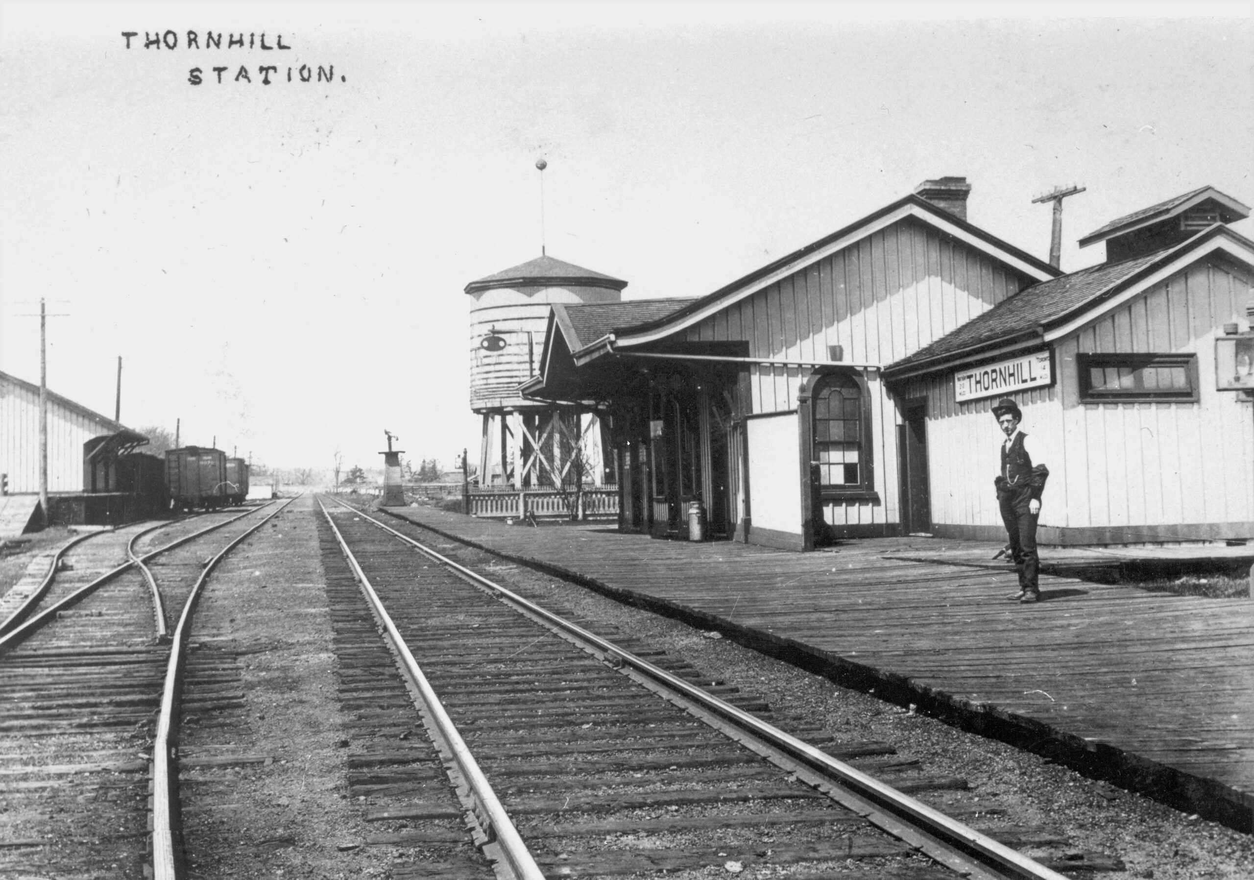 Thornhill Station was built by the Ontario, Simcoe & Huron Railway while construction was progressing northward from Toronto. It followed a standard design which the OS&H had built in numerous places on its original mainline to Collingwood – a wood frame building with board-and-batten exterior walls and a simple pitched roof. It was located closest to the rural Concord post office, though it was named for the small community of Thornhill roughly five kilometres to the east. The first train to Aurora arrived at Thornhill on May 16th, 1853, marking the beginning of revenue passenger service on the OS&H. Service was gradually extended northward over subsequent years, particularly after the OS&H was reorganized as the Northern Railway of Canada in 1858. By 1876, a total of five trains stopped at Thornhill Station on a daily basis.