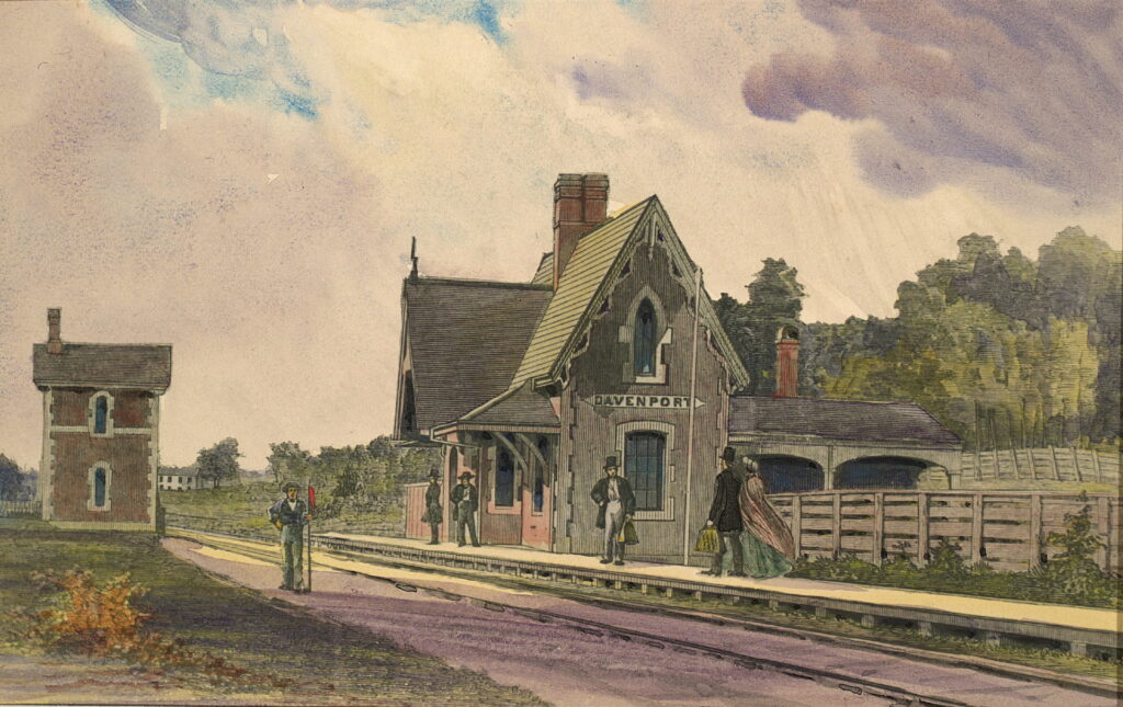 Davenport Station was built on the north side of Davenport Road by the Ontario, Simcoe and Huron Railway in 1853 while construction of the railway was progressing northward from Toronto. It was originally the OS&H railway’s first stop after leaving Toronto northbound. Although no photographs of this station are known to exist, it would have been a rectangular structure with board-and-batten exterior walls and a pitched roof that was elongated above the platform for shelter. It was located adjacent to the small community of Carleton which was established several years earlier. The first train arrived at Davenport Station on May 16th, 1853, initially only going as far as Aurora until service was extended further north in subsequent years. The railway brought prosperity and growth to Carleton Village, which got a post office by 1858 and a population of 150 by 1865. After the OS&H Railway was reorganized as the Northern Railway of Canada in 1859, the station quickly became inadequate for the local population.