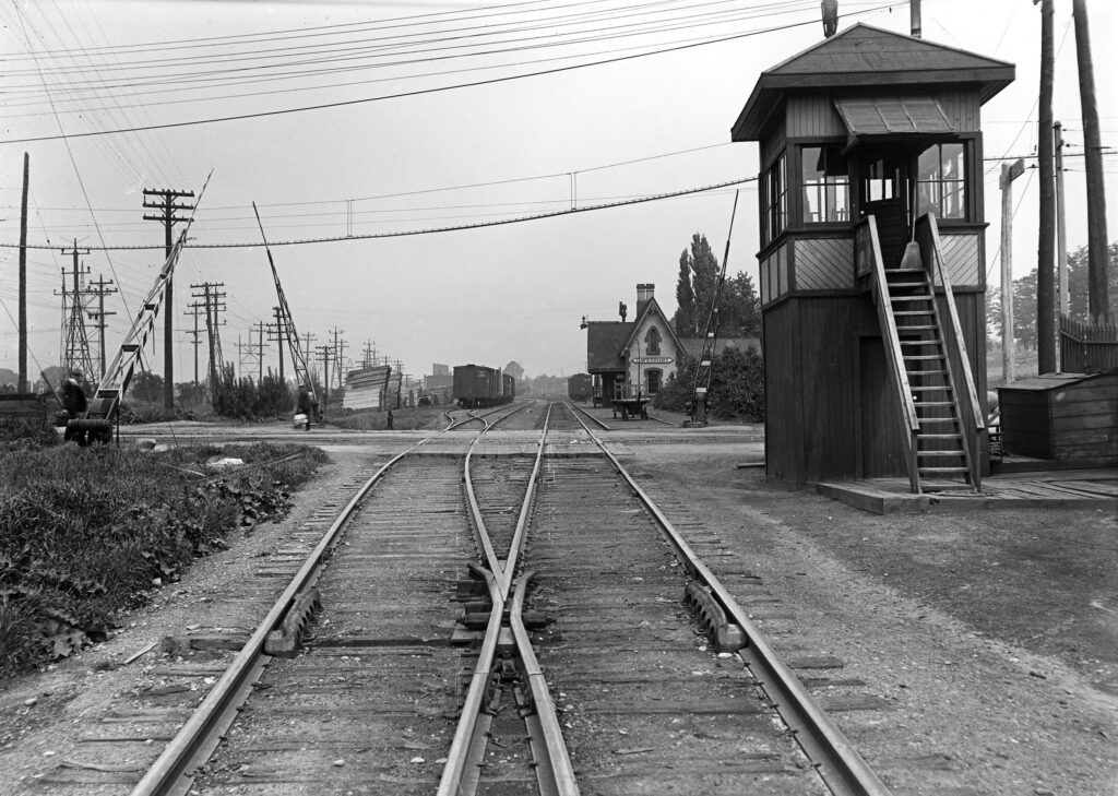 The Northern Railway replaced Davenport Station in 1866 with a smaller, albeit more architecturally interesting structure. The new station took many influences from Gothic architecture styles, which had become popular in England during the Gothic Revival movement of previous decades. By 1876 a total of six passenger trains stopped at Davenport Station per day. The Northern Railway of Canada merged with the Hamilton and North-Western Railway in 1879, forming the Northern and North Western Railway. Just under a decade later, the Northern and North Western Railway fell under the control of the Grand Trunk Railway in 1888. Over the course of the following two decades, the area around Davenport Station rapidly developed with new residents and industries. A 60-acre plot of land immediately southeast of the station became occupied by Canadian General Electric’s Canada Foundry in 1903. By 1913, service to Davenport Station had increased to fourteen trains per day. The Grand Trunk encountered financial difficulties through the early 20th century, culminating in its nationalization and subsequent absorption into the newly-formed Canadian National Railway in 1923.
