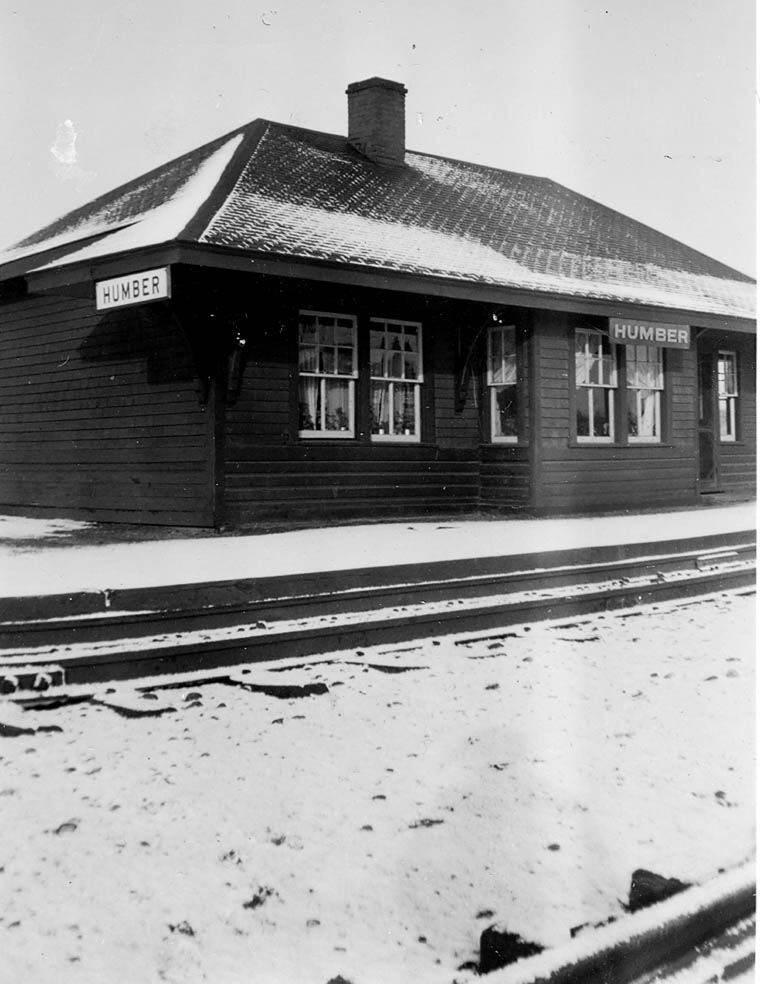 The transcontinental line of the Canadian Pacific Railway originally bypassed Toronto altogether upon its completion in 1885, and passengers would originally make use of a steamship service between Owen Sound and Port Arthur (Thunder Bay). Two decades later in 1905, Canadian Pacific began construction of a more direct rail link between Bolton and the transcontinental line in Sudbury. Humber was the first station north of Bolton on the new line, located on Humber Station Road north of Castlederg Side Road. The first train arrived at Humber when service to Craighurst commenced in November 1906. Traffic would increase once the line was completed to Sudbury on June 15th, 1908. The station building itself was a single-storey wooden structure with a hipped roof and a flared overhang to provide shelter above the platform. It likely did not see any significant amount of use due to its rural location and a lack of nearby settlements. In spite of this, a total of seven trains stopped at Humber Station per day by 1921. The Great Depression would see this reduced to six, followed by a significant increase to ten trains per day by 1940.