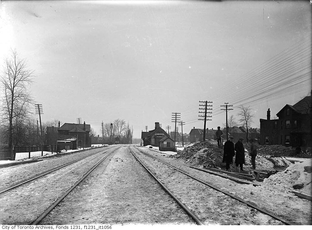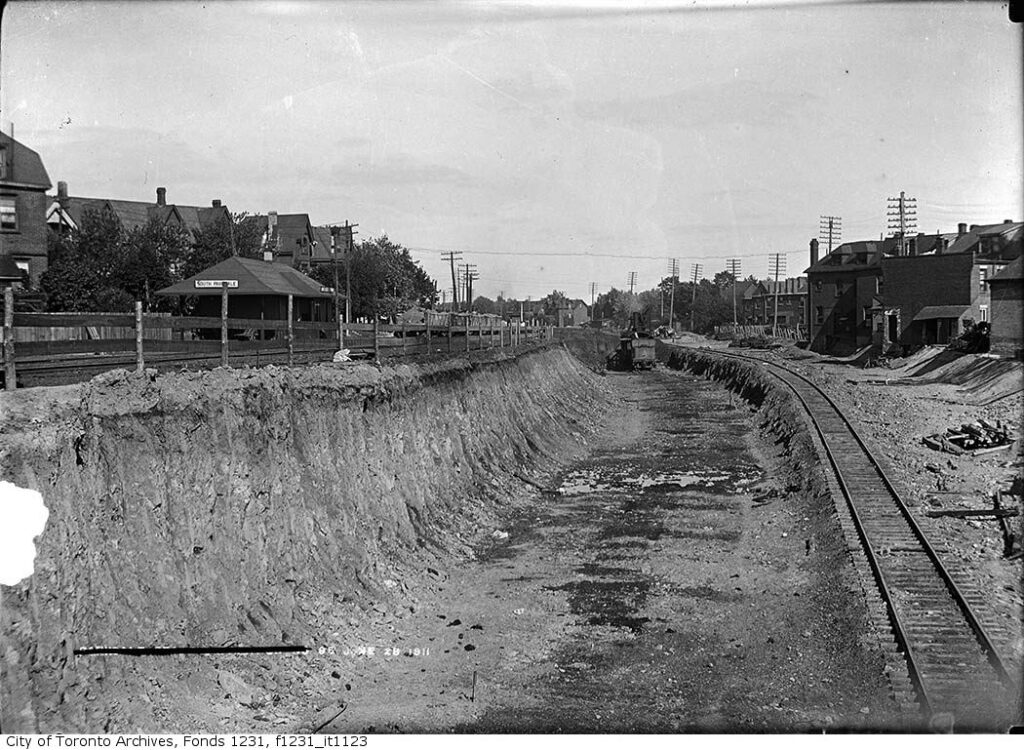 During the early 1900’s the Grand Trunk sought to eliminate a steep hill near South Parkdale as part of a project to widen the right-of-way from two tracks to four. The result would be that several roads nearby would pass over the rails instead of crossing them at grade, which had the added benefit of increased safety for pedestrians. This project would involve the closure of two stations, South Parkdale and Swansea, with a new station opening halfway between them at Sunnyside as a replacement for both. The project was approved by Toronto City Council on December 8th, 1909 and work began the following year. A temporary station at South Parkdale was built on the opposite side of Jameson along Springhurst Avenue in 1911, and the former Great Western station was closed to the public on December 1st of that year. It was subsequently demolished to make way for a deep trench where the new tracks were to be laid. The temporary station remained open until service was moved to yet another temporary station at Sunnyside in 1912.