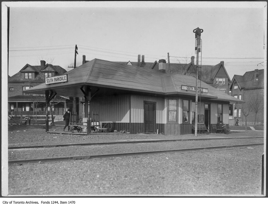 The Great Western Railway was built through the south end of Parkdale in 1855 while its branch line to Toronto was nearing completion. A station was not built here initially, but the growing population of Parkdale prompted the Great Western to do so over two decades later in November 1879. It was located at the foot of Close Avenue halfway between Jameson and Dunn Avenue. It was a small rectangular structure with a pair of gables at its west end, a Jerkinhead roof at its east end and a large chimney protruding from the top. Unfortunately, the lack of up-close images of this station make it difficult to determine the minute details of its architecture. The Great Western Railway was acquired by the Grand Trunk Railway in 1882. A total of ten trains stopped at South Parkdale on a daily basis by 1888, eight of which were Toronto-based suburban trains.