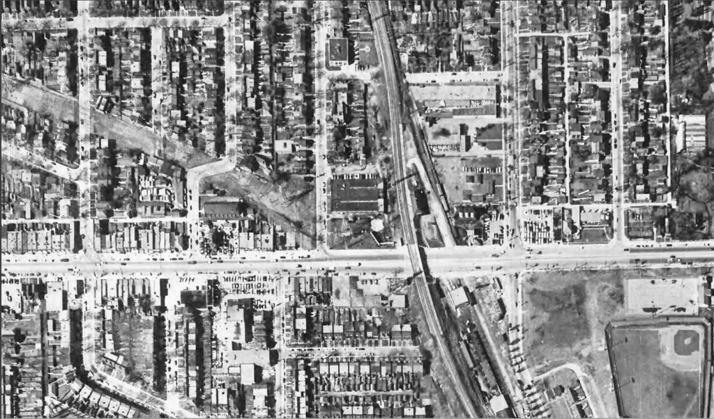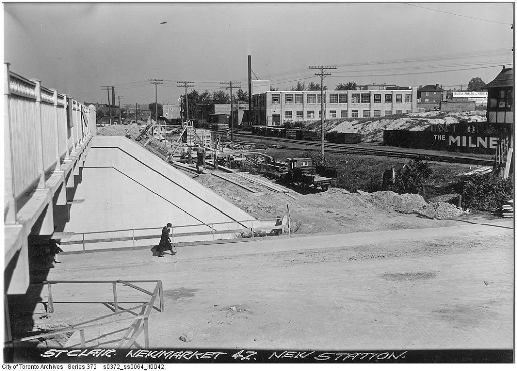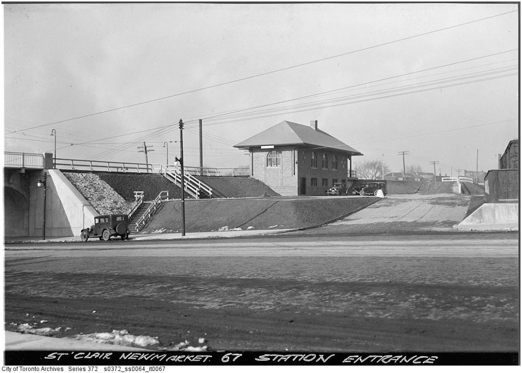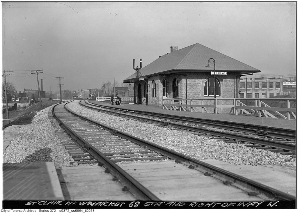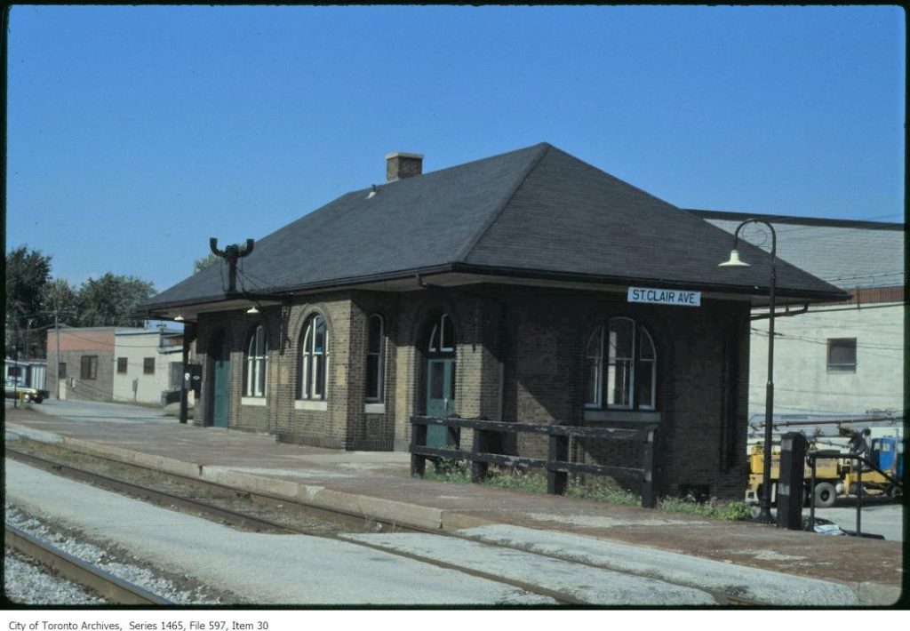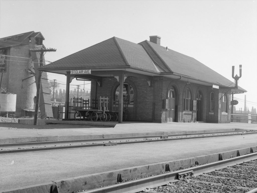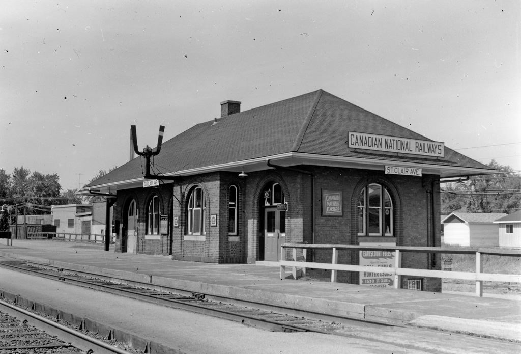The Canadian National Railway built St. Clair Avenue Station in 1932 as a replacement of the much older Davenport Station located a half kilometre to the south. The replacement came about as part of a project to lift the tracks from Davenport Road to Rogers Road above the grade of the city streets. The new station was located just north of the new St. Clair Avenue underpass on the east side of the tracks. It was a relatively simple rectangular building with brick walls and a hipped roof. It was technically two stories tall because of the steep embankment the building was situated on, with the second floor providing access to track level. In addition to CN service, the Ontario Northland Railway’s Northland train also stopped there until the late 1960’s or early 1970’s.