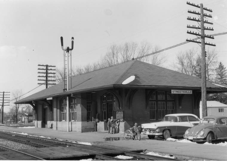 Service to the new Streetsville Station also suffered during the depression, decreasing to twelve trains per day by 1940. There would be a brief rebound during the postwar era but it was cut short by the popularization of automobiles and air travel. Ridership would decrease further with the completion of Highway 401 just north of Streetsville between 1959 and 1961, which generally ran parallel to the Toronto-St. Thomas line and served many of the same communities along the way. Service to Streetsville was reduced further to six trains per day in 1963, then only four in 1966. The introduction of self-propelled Budd Rail Diesel Cars as an economical alternative to conventional passenger trains helped to briefly increase service to nine trains by 1968, the vast majority of which were on the Orangeville line. Streetsville Station was closed to passengers in 1970 when service on both the Orangeville and St. Thomas lines ended in 1970. However, the station remained in use by Canadian Pacific as a train order office until it was finally abandoned and torn down on October 22nd, 1982.