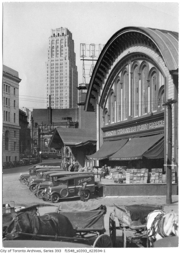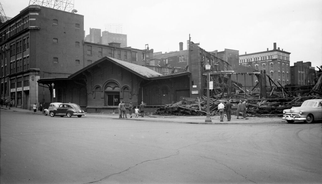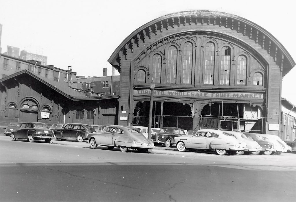 The Yonge Street station continued serving passengers until 1882 when the Great Western was acquired by the larger Grand Trunk Railway. Subsequently, the Yonge Street station was closed to passengers and converted into a bonded freight depot. To reflect the change in ownership, the “Great Western Railway” lettering above the train shed was replaced with “Grand Trunk”. The former station continued to be used in this capacity until 1896, and the building was sold off to a new private owner in 1904. It was converted once more into the Toronto Wholesale Fruit Market, which utilized the existing tracks into the building to take shipments of fruit by rail. Pacific Fruit Express reefer cars were consistently seen on the Esplanade at Yonge Street for many decades afterward as a result. The lake was filled in south of the Esplanade in the 1920’s, and the tracks leading into the former station building were subsequently removed and replaced with a loading dock for trucks. Unfortunately, a devastating fire tore through the building on May 17th, 1952, rendering it unsalvageable. The remnants were dismantled shortly thereafter and the O’Keefe Centre for the Performing Arts opened on the site in 1960. More recently, a large condominium tower was built on top of the area the station was located.