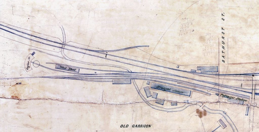 The Great Western Railway’s first passenger station in Toronto was built in 1855 near the present location of the Sir Isaac Brock Bridge. This coincided with the construction of the Great Western’s Toronto Branch – now the Lakeshore West Line – which opened to rail traffic on December 3rd, 1855. The Great Western also built a freight shed and a roundhouse nearby. The freight shed was responsible for handling freight from businesses in Toronto who were unable to get direct rail service. In addition to the storage and maintenance of locomotives, the Great Western roundhouse’s turntable was necessary to flip locomotives around as Toronto was the end of the line. Upon the opening of Toronto’s first Union Station on June 21st, 1858, the Great Western began using it as their main passenger terminal instead. The original station was then disused and dismantled shortly thereafter.