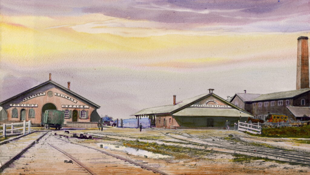A few years after the OS&H reorganized as the Northern Railway of Canada in 1858, trains began using its new passenger terminal at Brock Street (now Spadina Avenue) on January 9th, 1861. The new station was a basic wooden structure with a pitched roof and a canopy shelter extending to the west side of the platform. A sign reading “Northern Railway Passenger Station” was positioned on the east-facing exterior wall. It was nestled directly in the middle of the Northern Railway’s maintenance shops, about where the intersection of Fort York Boulevard and Telegram Mews is today. While this placed it at a somewhat inconvenient jog from where many residents of Toronto lived, it was well positioned to take advantage of steamship traffic on Lake Ontario. The Northern Railway built a new passenger station about two kilometres to the east at Jarvis Street in 1867, though the Spadina Avenue station would continue to see train service.