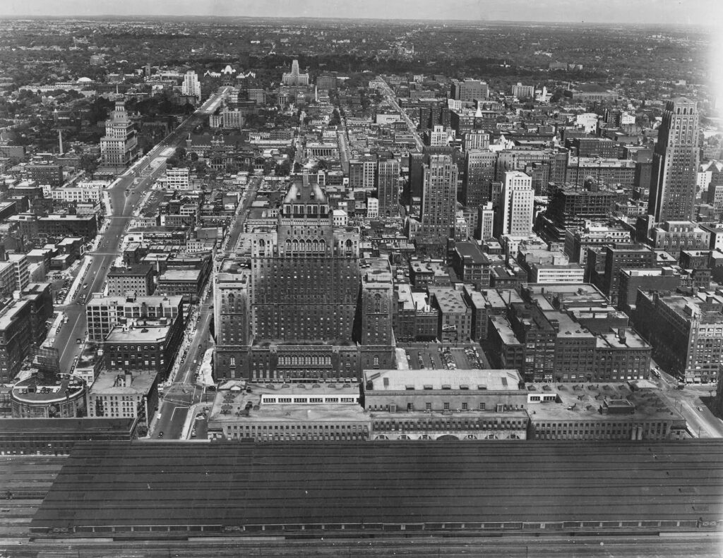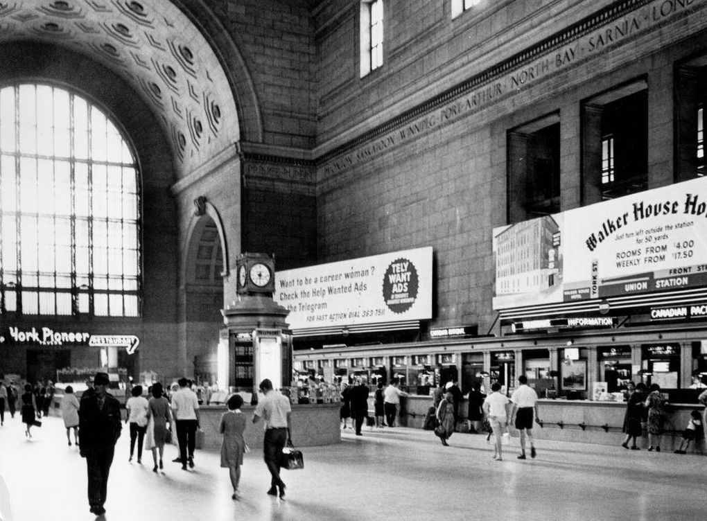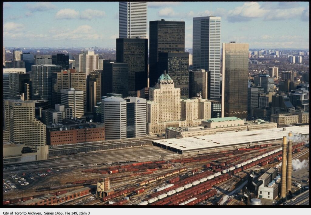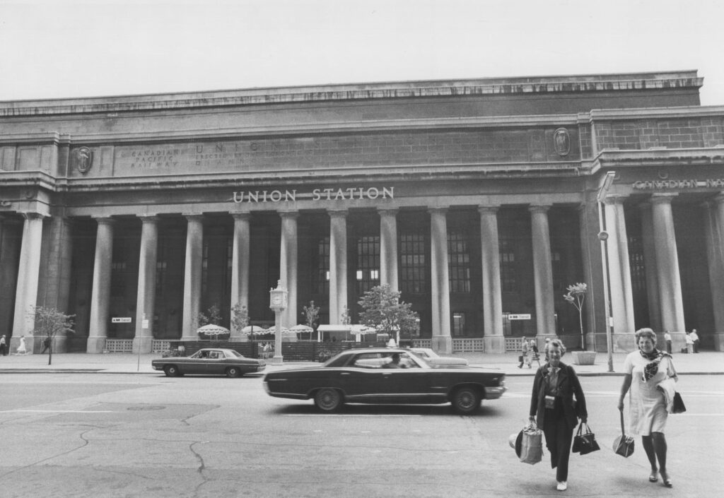 Ridership rebounded with the second world war, and by the postwar period Union Station saw upwards of 90-100 trains per day. However, this rebound was short lived as the popularization of automobiles and air travel began to take their toll on passenger ridership. Automobile travel within the city was made more convenient often at the cost of other forms of transportation, incentivizing commuters and other travelers to avoid the train altogether. The streetcar tracks on Front Street were removed around this time to make way for more lanes, marking the end of an important transit connection with Union Station. Shortly after the infamous demolition of New York City’s Old Penn Station in 1963, Union Station soon found itself in the crosshairs. Numerous media outlets wrote negatively of the station during this period, predicting or advocating for its removal and replacement in a similar manner to Penn Station. A proposal was made to replace the headhouse and trainshed with a vast “Metro Centre”, following the example of New York City in replacing the headhouse of old Penn Station with Madison Square Garden. Railway officials were favourable to this idea, and it was only through advocacy groups and their support from Mayor David Crombie that these plans were averted. Union Station was declared a National Historic Site of Canada in 1975 which protected it from future demolition. Plans for the Metro Centre were scaled back, and some elements such as the CN Tower and Metro Convention Centre were built elsewhere.