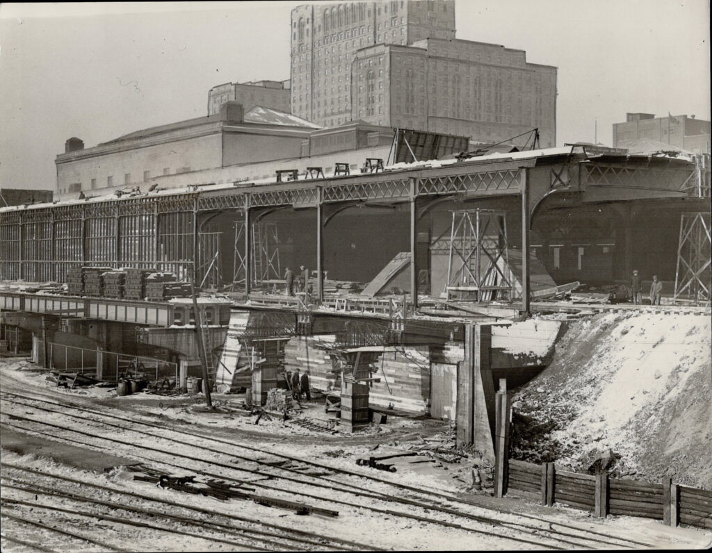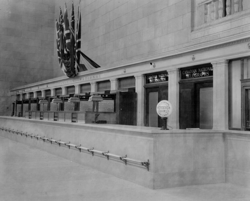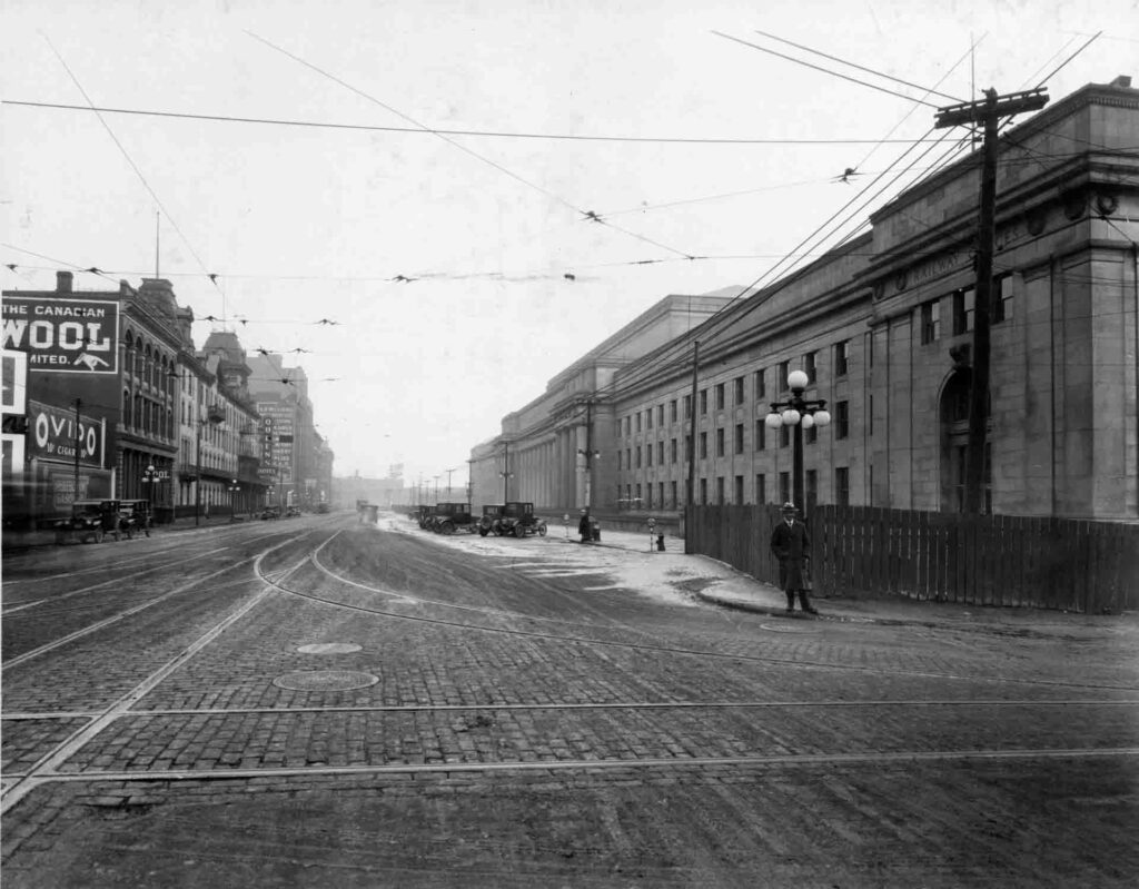 The new Union Station’s headhouse had finally reached a finished state in 1918, though much work was still needed. Its design followed the Beaux-Arts architecture style which was exceedingly popular for major railway terminals across North America at the time. The exterior is made almost entirely from a beige limestone, including a colonnade at its grand entrance comprising of 22 doric columns. Upon entering, passengers would be greeted with a “Great Hall” measuring 79 metres long with an arched ceiling 26 metres overhead. Zumbro stone was brought in from Minnesota for the interior walls, chosen for its light-reflecting qualities. Tennessee marble was used in the floors and stairways. The Great Hall is considered by many architectural historians to be one of the finest public rooms in Canada. In 1919, stone carvers engraved the walls inside the Great Hall with the names of all the important cities in Canada connected to Toronto by passenger train. The exterior façade along Front Street was also engraved with the names of the Grand Trunk Railway, Canadian Pacific Railway, and the Toronto Terminals Railway. The post office and railway offices began occupying the east and west wings respectively in 1920, but the rest of the station remained unused. There was still debate over how to handle grade separation of the rail corridor, and the platforms could not be completed until the final elevation of the tracks was determined.