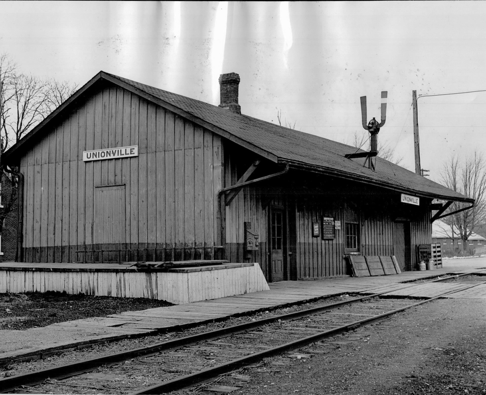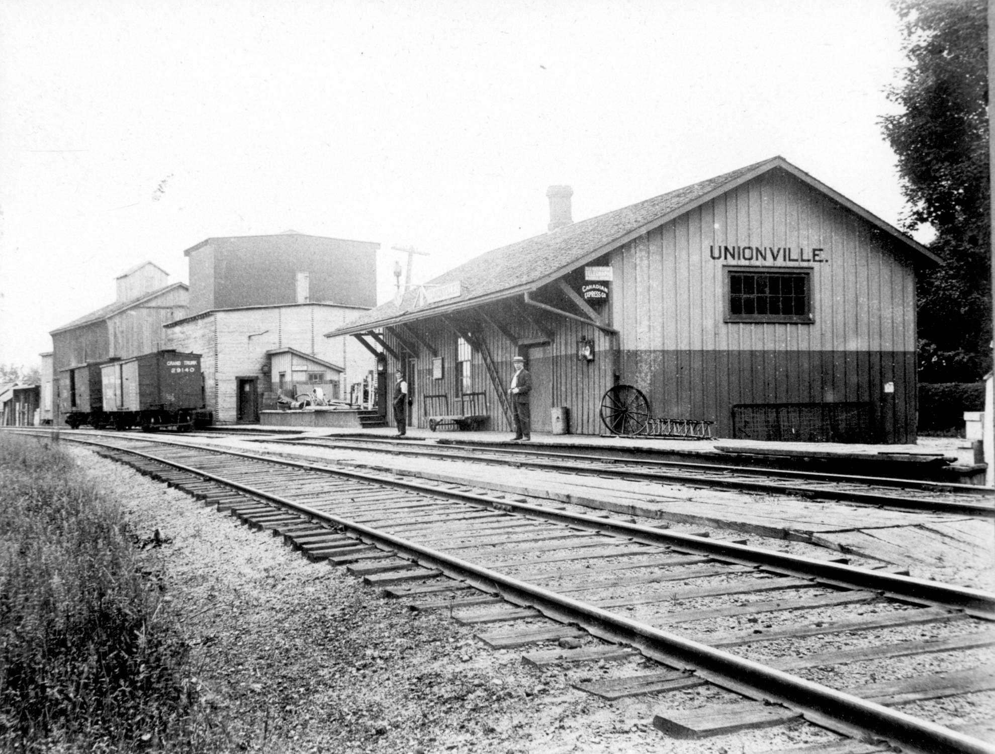 Unionville Station was built in 1871 by the Toronto & Nipissing Railway while its construction was progressing north towards Uxbridge and Coboconk. It was a simple board-and-batten structure with a lean-to roof designed to keep passengers on the platform protected from the elements, following a standard design that was built extensively by the Toronto & Nipissing in other communities. It contained a waiting room, baggage room, and the station agent’s office, and unlike other stations on this line it would see very few modifications over the years. The first train arrived from Toronto on July 1st, 1871 while construction north of Uxbridge was still underway, and service through to Coboconk became available in 1872.