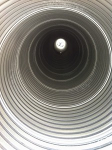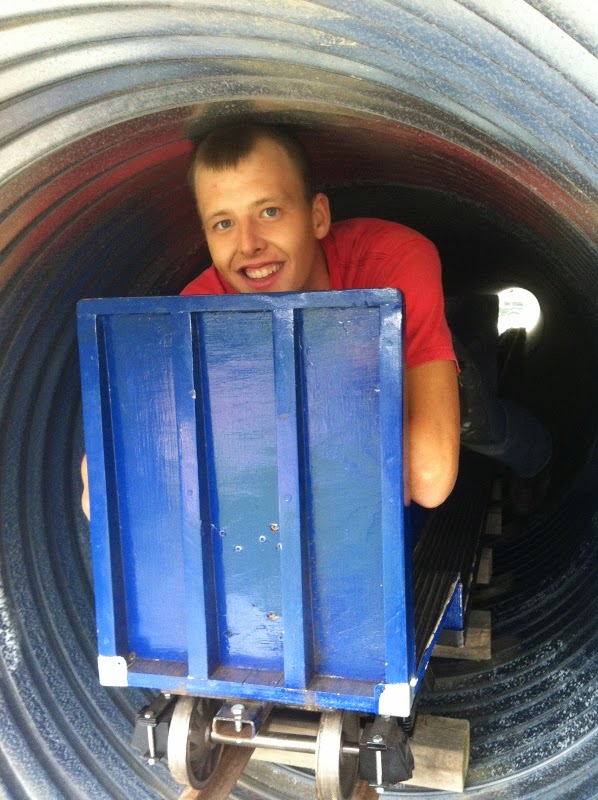 “For some time we have been awaiting delivery of some steel culvert for a miniature train storage tube. Today (September 11th, 2014) it arrived! As planned we quickly assembled the two 10 metre lengths and rolled the now 20 metre long tube into its previously prepared space. At 1,050 mm (41.5″) diameter and some sixty-five feet in length, it was a formidable looking bit of pipe. Once it was in place, we bolted stored track panels together and pulled them into the tube. As we see below. Aaron was first passenger on the new TRHA ‘subway’ system.