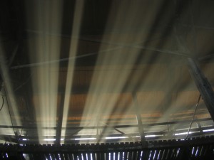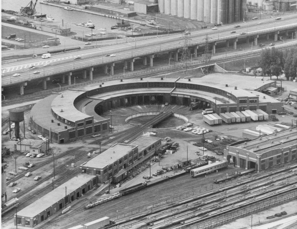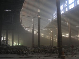 The centre picture is one of the best pictures in the City of Toronto archives of the John Street CPR Roundhouse near the end of its operating life. A few days ago, Michael Guy took the picture at the right of a major part of the roundhouse with several walls having been removed revealing the expansive majesty of the roundhouse as it once looked. The dust in the air is the result of soda blasting during renovations being undertaken to clean and restore the interior. At the left, Michael has also captured the sun as it shines through the roundhouse windows making a beautiful pattern through the dust.