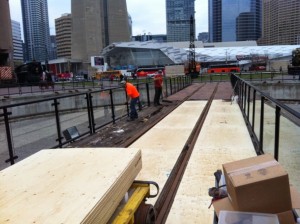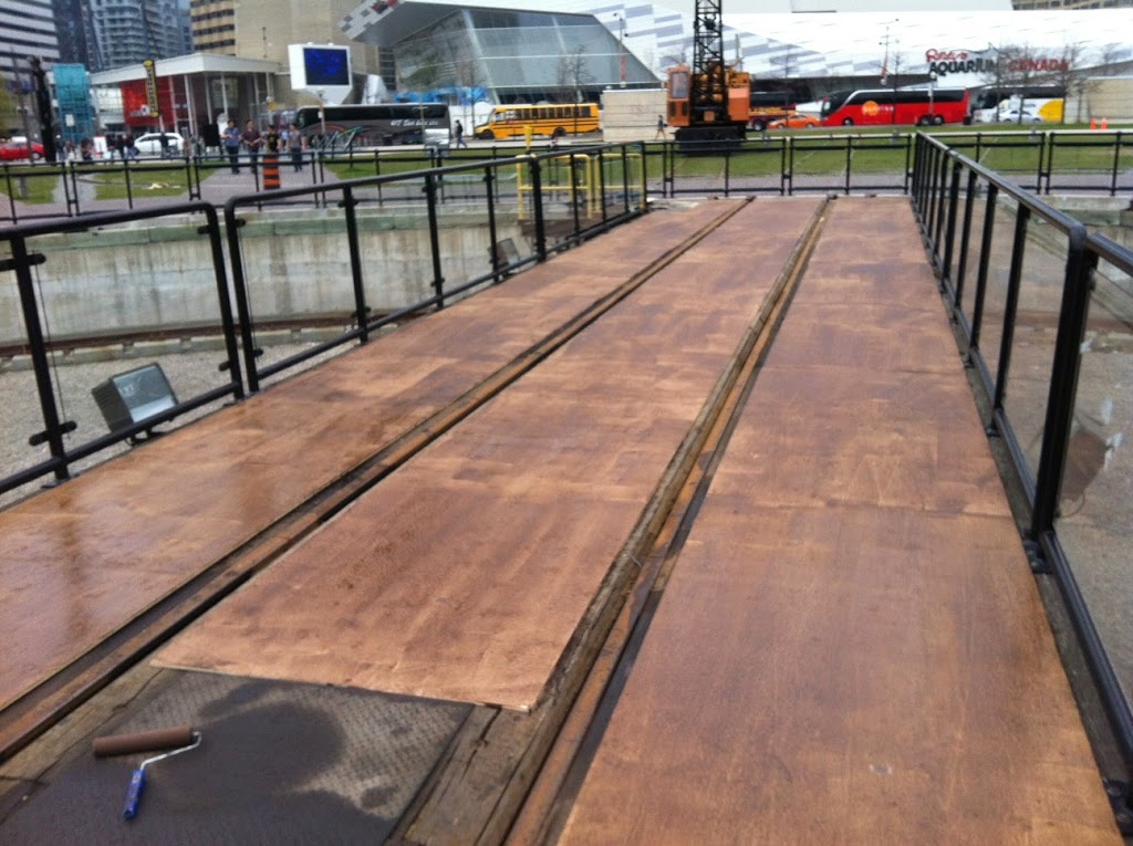 After five years of exposure to the elements, the timbers on our turntable deck will need to be replaced, likely in the spring of 2015. Meanwhile, to ensure a safe surface for volunteers and visitors (when the deck is open to them), we have covered the deck with sheets of plywood and stained the plywood as the surface is otherwise pretty bright in colour as can be seen below.