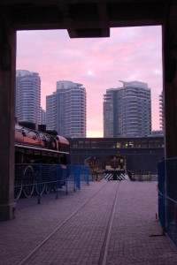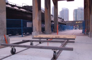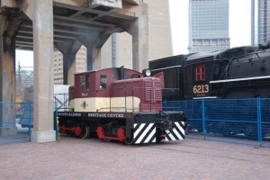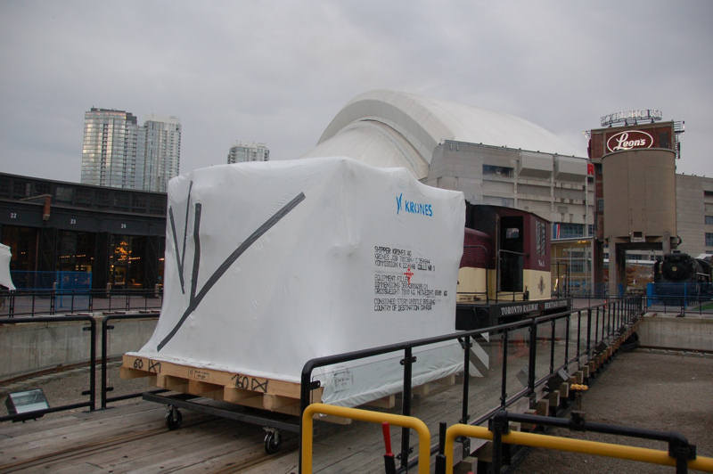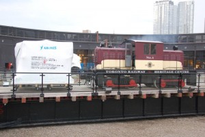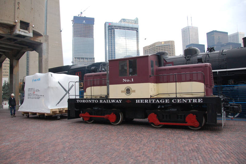 The Toronto Railway Heritage Centre (TRHC) operates its first legitimate freight train (as opposed to just moving equipment around) when Steam Whistle Brewing took delivery of a new canning machine. The machine was loaded onto a custom rail car (see picture – middle above) at the end of track 33 under the coaling tower and moved to the turntable and then to stall 8 of the roundhouse using TRHC #1. The rail move was necessary since the new patio paving stones surrounding the turntable precluded a truck move from Bremner Boulevard.”