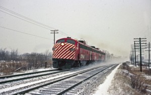 “On a bleak Christmas Eve in 1970, Canadian Pacific’s flagship transcontinental streamliner, No. 1, The Canadian, speeds through Beaconsfield, Quebec on its 2,880-mile journey to Vancouver, BC. The trip began fifteen miles to the east at CPR’s venerable Montreal passenger terminal, Windsor Station at 1:55 PM. Between 11:40 PM that evening and12:30 AM on Christmas Day, this train will be combined with No. 11, The Canadian’s Toronto section, at Sudbury, Ontario.