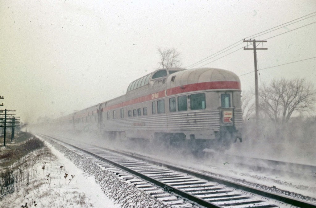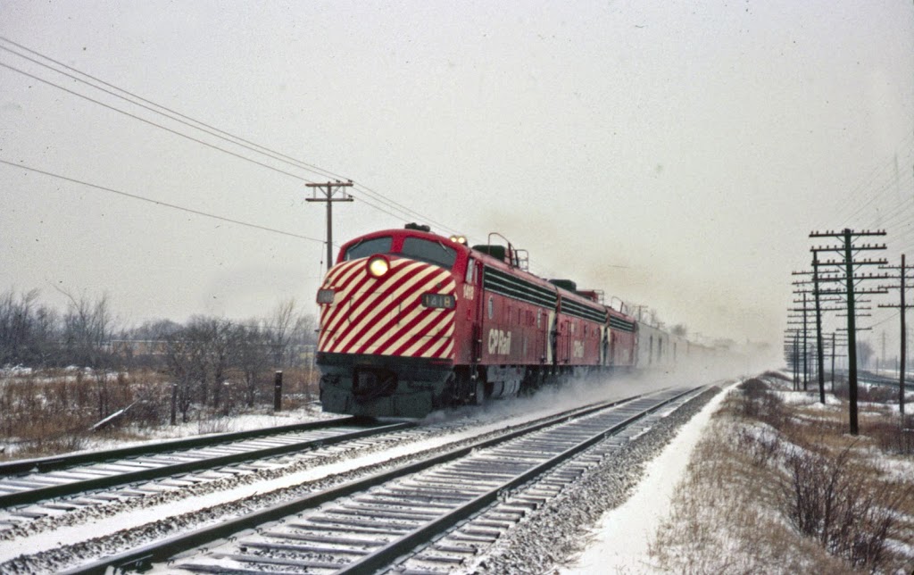 “On a bleak Christmas Eve in 1970, Canadian Pacific’s flagship transcontinental streamliner, No. 1, The Canadian, speeds through Beaconsfield, Quebec on its 2,880-mile journey to Vancouver, BC. The trip began fifteen miles to the east at CPR’s venerable Montreal passenger terminal, Windsor Station at 1:55 PM. Between 11:40 PM that evening and12:30 AM on Christmas Day, this train will be combined with No. 11, The Canadian’s Toronto section, at Sudbury, Ontario.