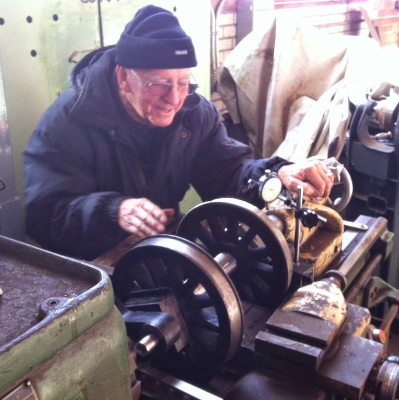 Elsewhere, volunteers were hard at work continuing maintenance on the Sweet Creek live steam locomotive in the mini-depot. Below, we see Mike using our “new” lathe as an inspection tool to check one of the driving axles.