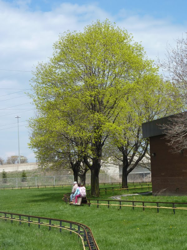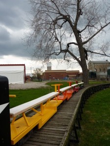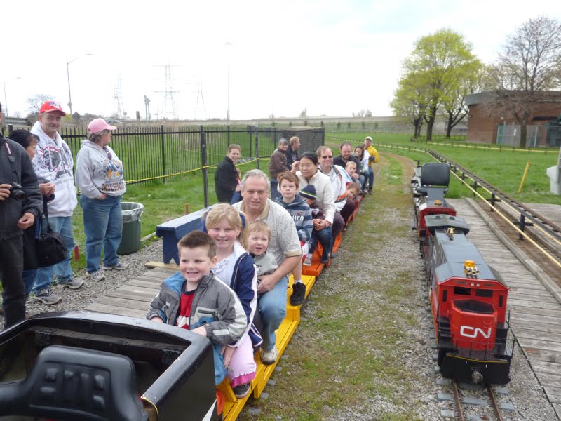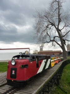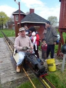Our TRHC miniature railway was built by a band of volunteers, many of whom were drawn from one of three local miniature railway clubs in the Toronto area. One of these clubs, the Golden Horseshoe Live Steamers (GHLS) of Hamilton, Ontario held their first operating weekend this past weekend on the occasion of Hamilton’s Doors Open weekend. The event was a great success with a great turnout by the public. In the attached pictures we find a pair of electrically powered diesels and an old amusement park diesel engine on a gas-hydraulic powered chassis (similar to the one he built for the Mini-Whitcomb at the TRHC) built by Michael Guy of the TRHA which hauled over 1500 passengers during the weekend. The brightly coloured passenger cars were out on their first outing after having been rebuilt in a plant owned by two of our members.