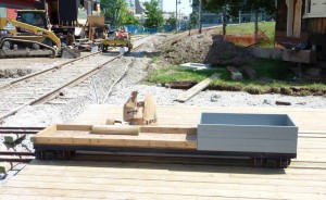 Given the usefulness of our speeder trailer cars in support of track maintenance, our team built a work car for the miniature railway. It is shown in the picture at the upper left and has been named “Chester”. In the middle photo, we see a completed miniature railway crossing of one of the concrete paths being developed in the park. In the right hand photo, we see some of the extensive concrete formwork being built throughout the park as the concrete paths are rebuilt to accommodate the new buildings, the new radial tracks and the miniature railway.