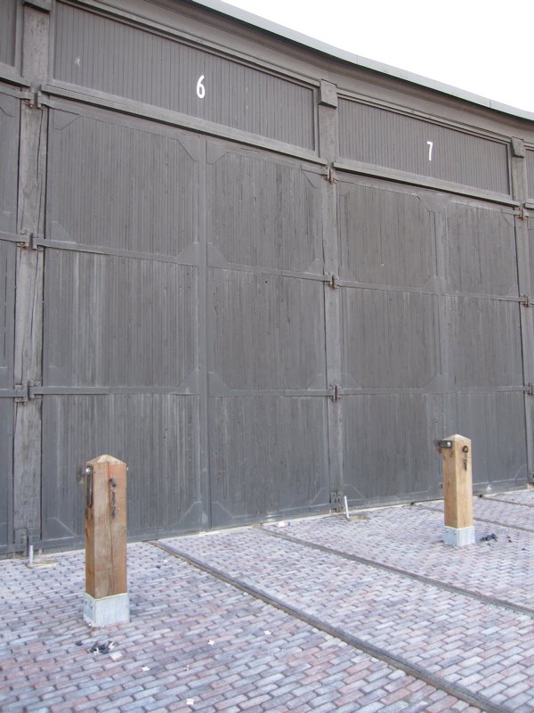 The panoramic view in the middle picture shows the beginnings of the final look of the turntable and the park looking north from the museum stalls. The turntable pit safety fence makes its first appearance in this photo. In the picture at the right above, we see the first photos of the finished door posts.
