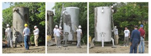 Since 1929 a feature of the rear of the roundhouse has been a pair of large air receiver tanks, part of the extensive compressed air supply system associated with both the John St roundhouse and it’s now demolished CNR counterpart across the street. Recently there has been discussion of whether these tanks were worth saving or perhaps be scrapped. To clarify the look of these period industrial artefacts, we decided to give them a fresh coat of aluminum paint. In the pictures below, we find the TRHA volunteers painting the tanks. The tank seen here begins to look quite resplendent with its riveted construction and shapely cast-iron legs.