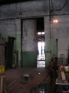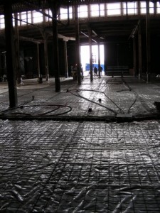 The view shown in the picture at the left above through the door from the machine shop to stall 25 will disappear very shortly when the opening is bricked up. In the middle picture, we see the steel reinforcing mesh laid over the plastic ready for the concrete floor to be poured in stalls 18 to 23. In the picture at right, we find a remaining relic of the old days – the gate to a steel pipe storage rack.