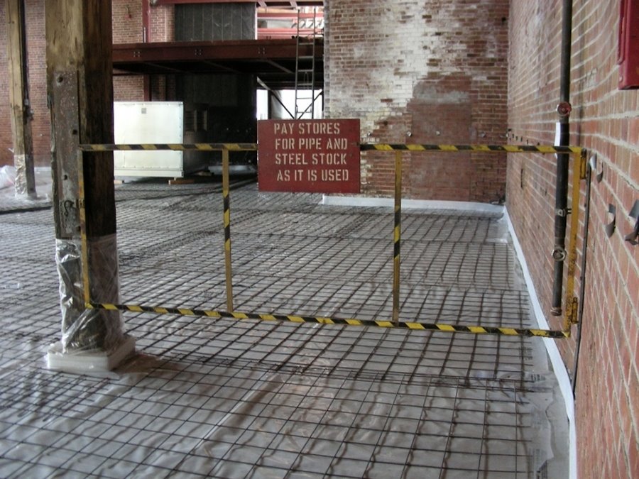 The view shown in the picture at the left above through the door from the machine shop to stall 25 will disappear very shortly when the opening is bricked up. In the middle picture, we see the steel reinforcing mesh laid over the plastic ready for the concrete floor to be poured in stalls 18 to 23. In the picture at right, we find a remaining relic of the old days – the gate to a steel pipe storage rack.