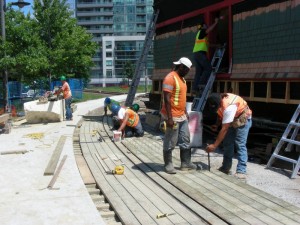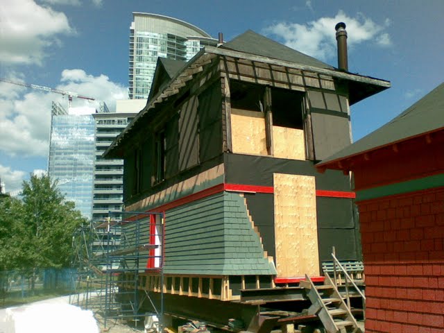 In the picture at the upper left, we witness a derailment in Roundhouse Park! A bit of enthusiatic pushing over a mud-clogged crossing resulted in our speeder work car hitting the ground. It took the combined efforts of four of us to get it back on the rails. In the middle picture above, we find the carpenter crew hard at work laying the deck past the north side of signal cabin D. In the photo at the right above, we find that the shingling of the sides of Cabin D is progressing well.