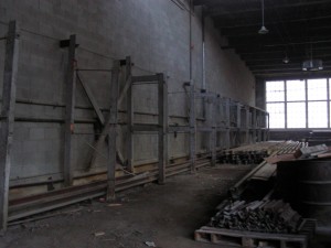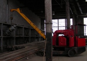 Last Sunday was spent inside the roundhouse moving artefacts from stall 32 into the machine shop and dismantling about two-thirds of the large wooden racking in stall 31. Orin K., Andrew J.and myself did much of this work with help from a Brook Restoration crew and a small forklift from Western Mechanical. The rack material, mostly 5 x 6 inch clear fir timbers 12 feet long, has been stored against future use. Amongst the items moved were a large motor-generator set, an Ingersoll-Rand air compressor and motor, the Elwell-Parker crane, a railway safe, two skids of ties for the miniature railway, a wheel (axle) jack from one of the wheel drop pits and a host of smaller items.