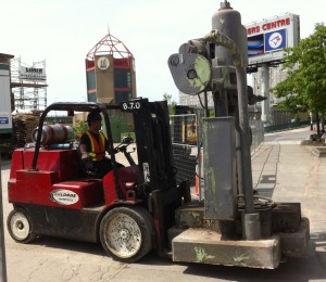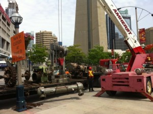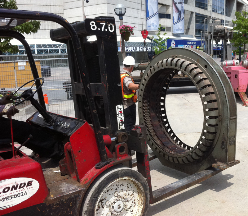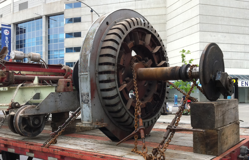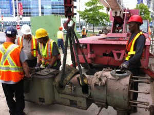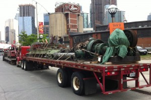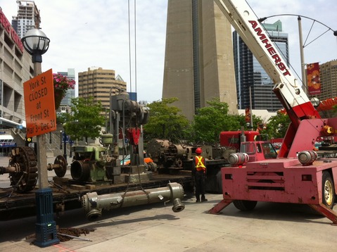 As reported before, contractors are now actively working on disassembling the machine shop in order to allow Toronto Hydro to build their underground electrical substation behind the Roundhouse. In order to do so, the heavy artefacts in the machine shop are now being retrieved and stored offsite.