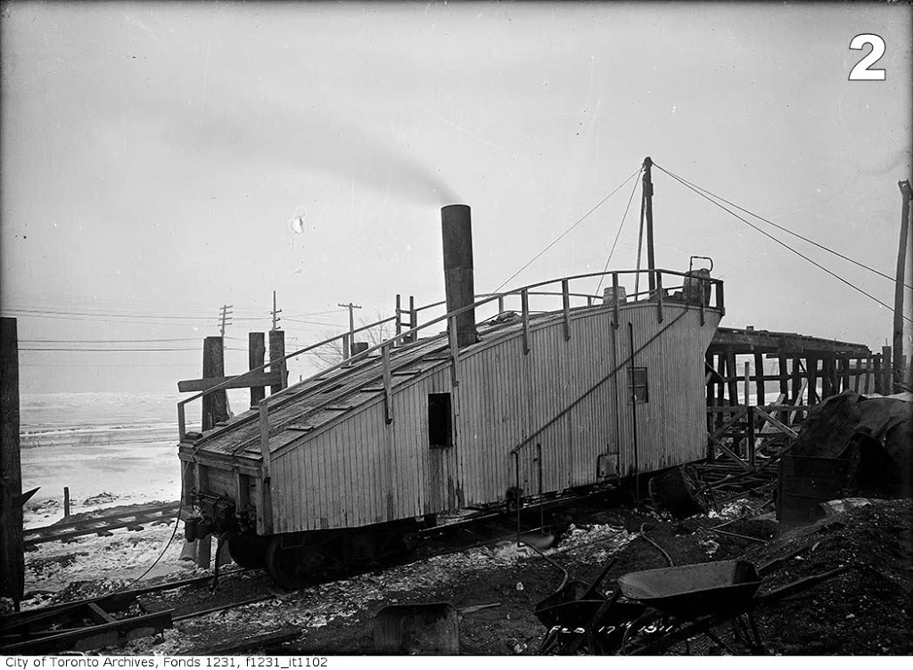 Image #2 is dated February 17, 1911. The location is along the Lakeshore near High Park and it shows the reconstruction of the Grand Trunk Railway, now Canadian National’s Oakville Sub. What is that contraption and what is it used for?