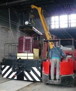 Today a TRHA crew braved -26C wind chill to start maintenance on the CLC-W locomotive’s rear engine. Inside the roundhouse, with the sun shining through the south windows, the temperature was pleasant and high enough that we could work without gloves. Bob D., Dave W. and new member Todd S. used Elwell-the-Crane to lift the rear hood off and then removed the middle set of engine doors on both sides. Once access was clear we removed the three air cleaners, the radiator fan and finally the coolant circulating pump which requires a new shaft seal. The air cleaners appear to be completely choked with oily black dirt, suggesting this might be one reason the engine won’t run.