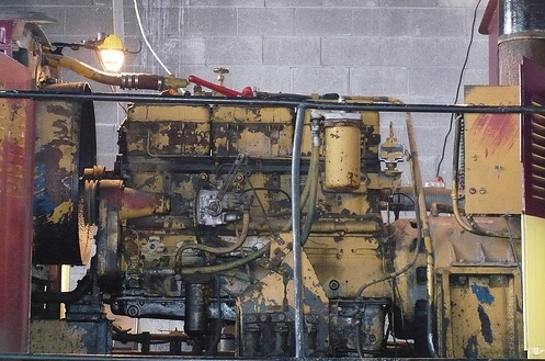 The rear engine is a Cummins six cylinder diesel model HBI-600 built in 1950. It has been retrofitted with a type PT fuel pump. To the right of the engine and bolted to it is a Westinghouse traction generator.