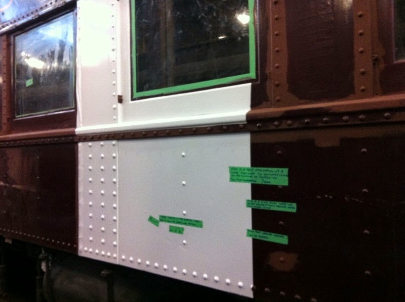 As we approach a time when we will be “resurfacing” the exteriors of the Cape Race and the Jackman passenger cars, we have been exploring alternatives to painting the cars.  One alternative is to apply a plastic wrap technology similar to those used to apply advertising on TTC streetcars and buses.  In the process of checking out this option we had such a plastic wrap surfacing treatment applied to applied a small area on the Cape Race car.  The results can be seen below.