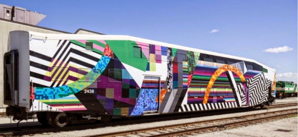 Also shown below is the extreme patterns which can be applied using this technique.  The photos show a GO Transit passenger car which traveled their transportation system in the summer of 2012.     It was used to generate debate and public input on our environment, cities, transportation and sustainability. Discussion was encouraged through an online “app”.