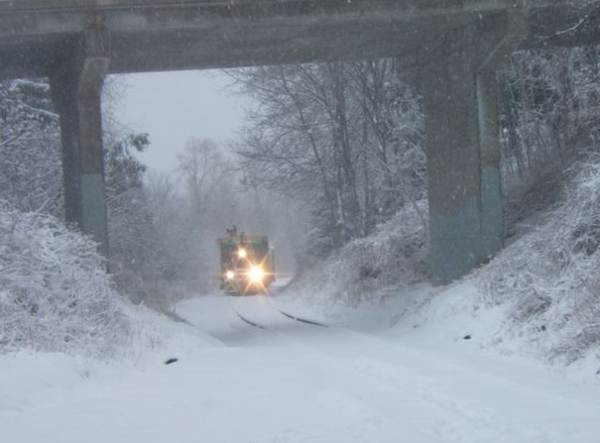 Pictured above at the left and in the centre is the Santa Train operating on the Port Stanley Terminal Railway on December 16th 2007 at the height of an early winter snowstorm. At the right, we have a picture (from the picture collection of a globe trotting couple at this website) of a seasonal Christmas exhibit somewhere in South America which offers a humorous takeoff on a famous picture of a century ago of “the French passenger train that didn’t stop soon enough”.