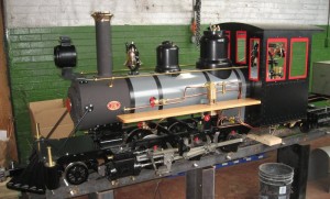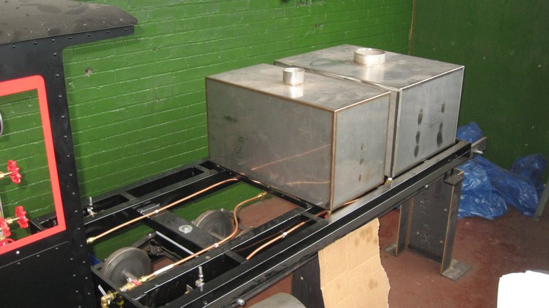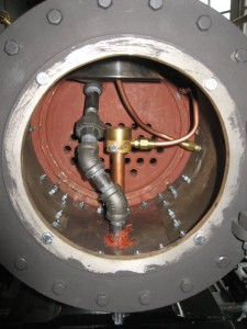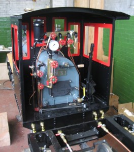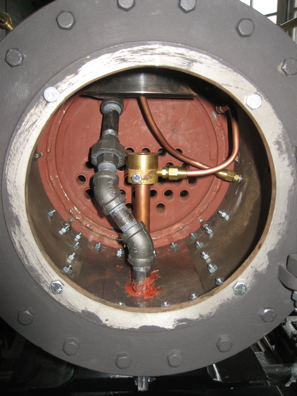 TRHA volunteers continue to make progress on completing our live steam locomotive. In the picture at the above left we see in this side view that the locomotive is starting to look very attractive with its newly painted surfaces. In the next photo, we see the interior of the cab as well. In the picture at left below we see the two tanks sitting on the tender frame. The tender body has returned from being painted but has not as yet been reunited with the frame. In our final photo below, we take a peek inside the snokebox door where we can the ends of the fire tubes.