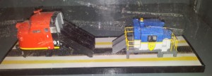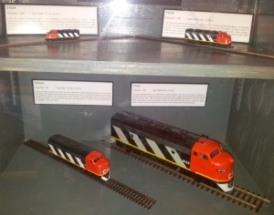 On the back platform of our U33C Full Cab Simulator System, our museum volunteers have used a display case to show models of some of the engines and cabs in our collection.