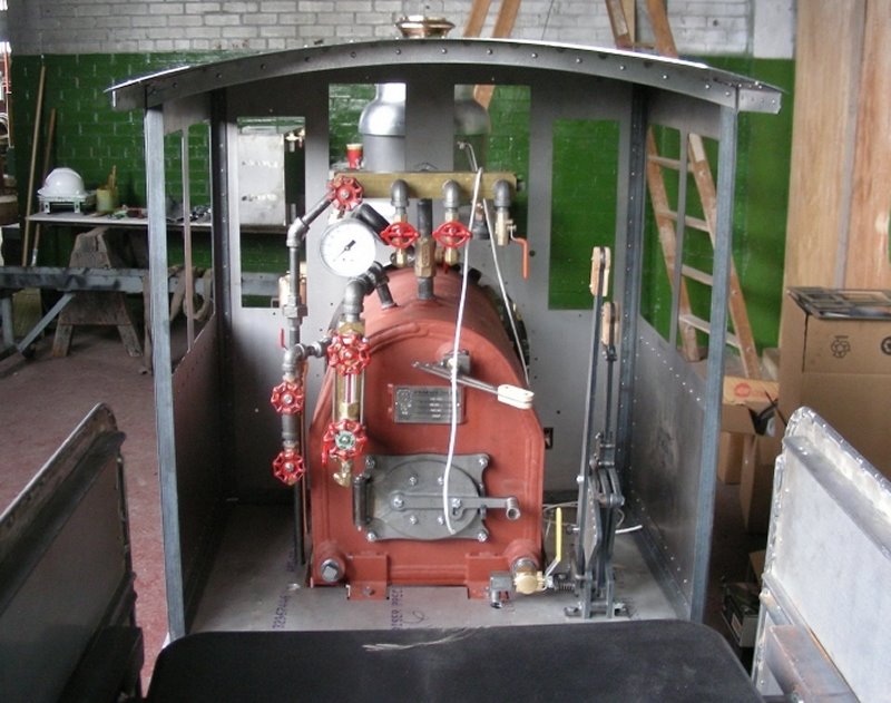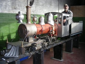 The TRHC’s miniature steam locomotive was moved into the newly cleaned and painted roundhouse blacksmith’s shop today. In the picture at left, we find Dave using the newly installed chain hoist to lift the locomotive from a rolling stand onto a more secure elevated assembly track. The locomotive and its tender are seen together for the first time in the middle picture. TRHA Director Michael Guy is sitting on the tender in the engineer’s position. Finally in the right hand picture, we see the engineer’s view of the cab interior.