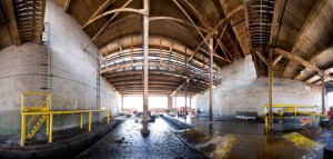 Norm Betts is a professional photographer who has been commissioned to photograph the development of Roundhouse Park and the Roundhouse itself. He has generously allowed the TRHA to share these photos with our readers. In the picture above, Norm has taken a panaramic photo of the opening of Leon’s. In the panoramic picture below, we see the current state of the three bays to be dedicated to restoration activities within the museum. The nature of the panoramic image provides a very interesting distorted perspective on this space.