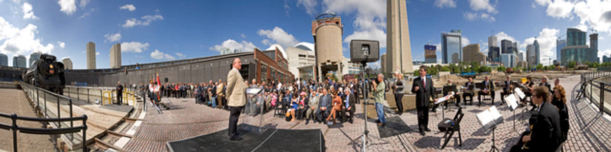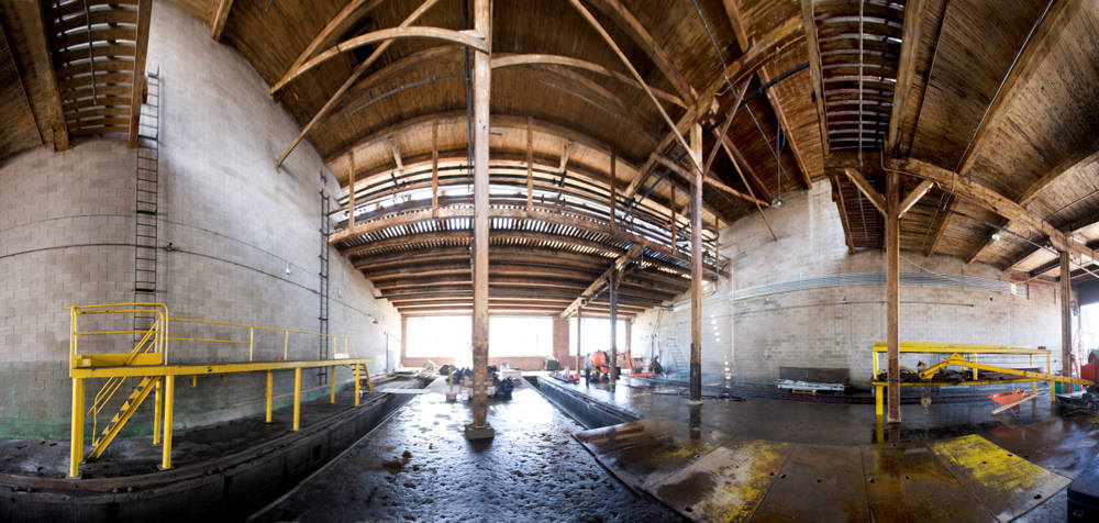 Norm Betts is a professional photographer who has been commissioned to photograph the development of Roundhouse Park and the Roundhouse itself. He has generously allowed the TRHA to share these photos with our readers. In the picture above, Norm has taken a panaramic photo of the opening of Leon’s. In the panoramic picture below, we see the current state of the three bays to be dedicated to restoration activities within the museum. The nature of the panoramic image provides a very interesting distorted perspective on this space.