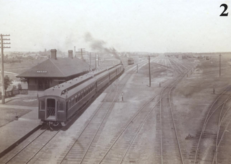 Image #2 has the most detailed caption on the back. “Little York station and yards, July 1, 1901, 2:00 pm train for Brockville.” The photograph is looking east and was taken from the Main Street bridge. In 1884, the Grand Trunk Railway built a 420-car freight yard seen in the distance on the right. Out of camera range on the right was a 31-stall roundhouse. Nearby residents had long resented the fact that many people referred to their community as Little York, to distinguish it from York (Toronto) and New York. They lobbied for the station to be renamed East Toronto but the railway refused. In 1922, GTR renamed the station Danforth.